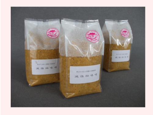 認定特産品の特色「安全で健康的な味噌を自分たちの手で作ろう」をキャッチフレーズに30年以上減塩味噌を作り続けています。地元産無農薬青ばた大豆、米麹、麦麹を原材料に、赤穂の天然塩を使い防腐剤や調味料などを一切使用しない味噌で、長年地域の人々に親しまれています。毎年2月に仕込みを行い10月頃に完成するこの味噌は、熱処理がされていないため麹が生きており熟成が進んでいるのが特徴です。